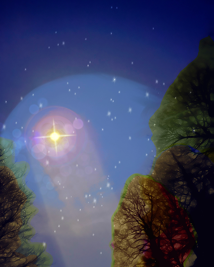 In my contacts I can see another colour around the moon as if the blue splits into red and dark purple, then comes back to blue – it actually looks like an old fashion screen-print with colours being slightly offset when overlapping one another,