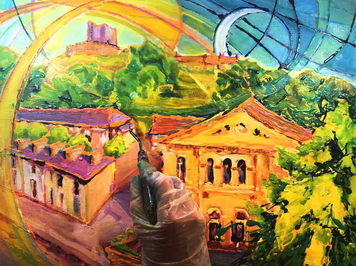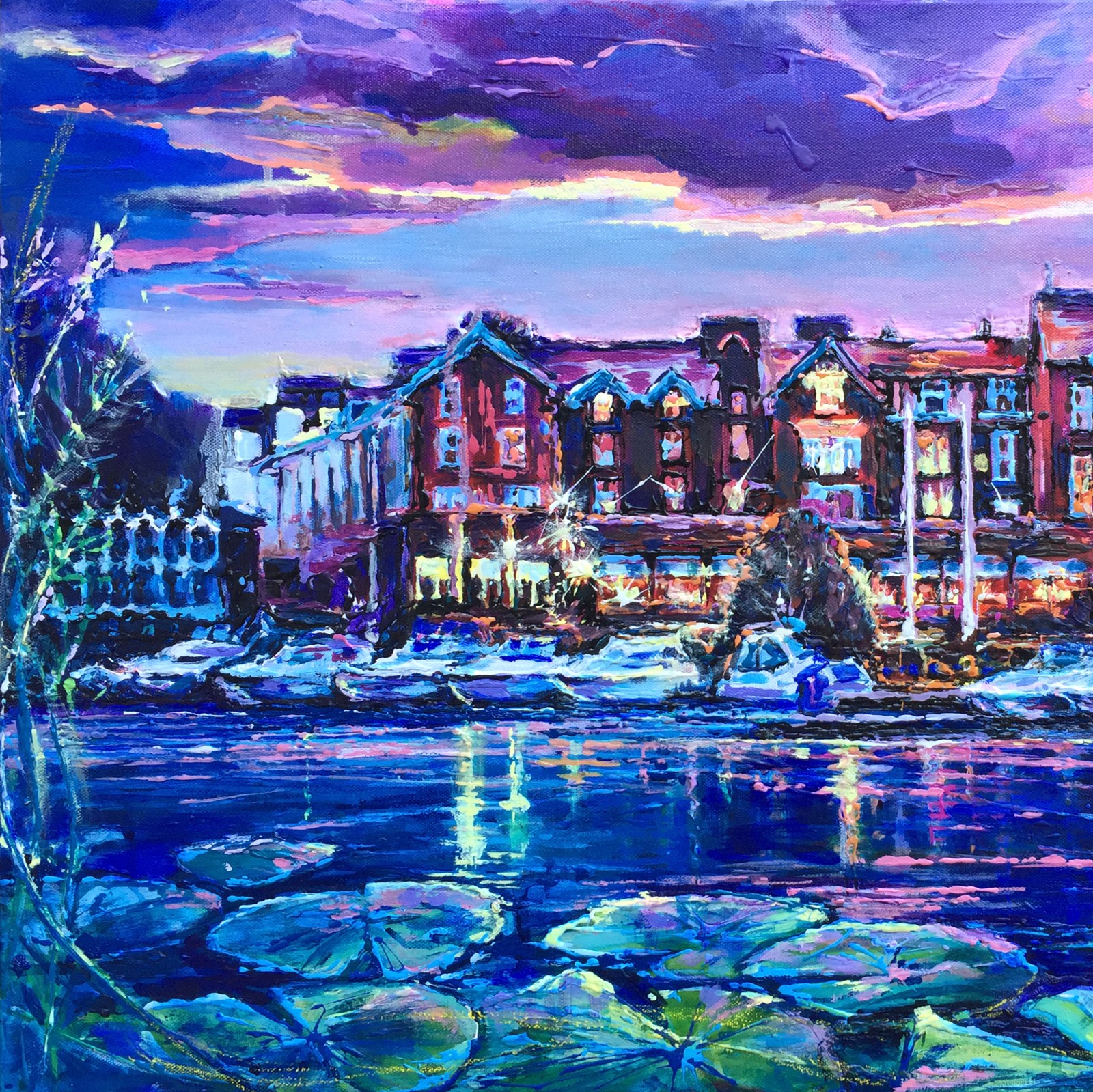 As well as capturing the beauty of day I tried to include the cooler shades of the night sky, hinted by the moon. The painting depicts the rays of the sun tightly hugging the town regardless of the time of day. Do you feel the energy radiating from this?