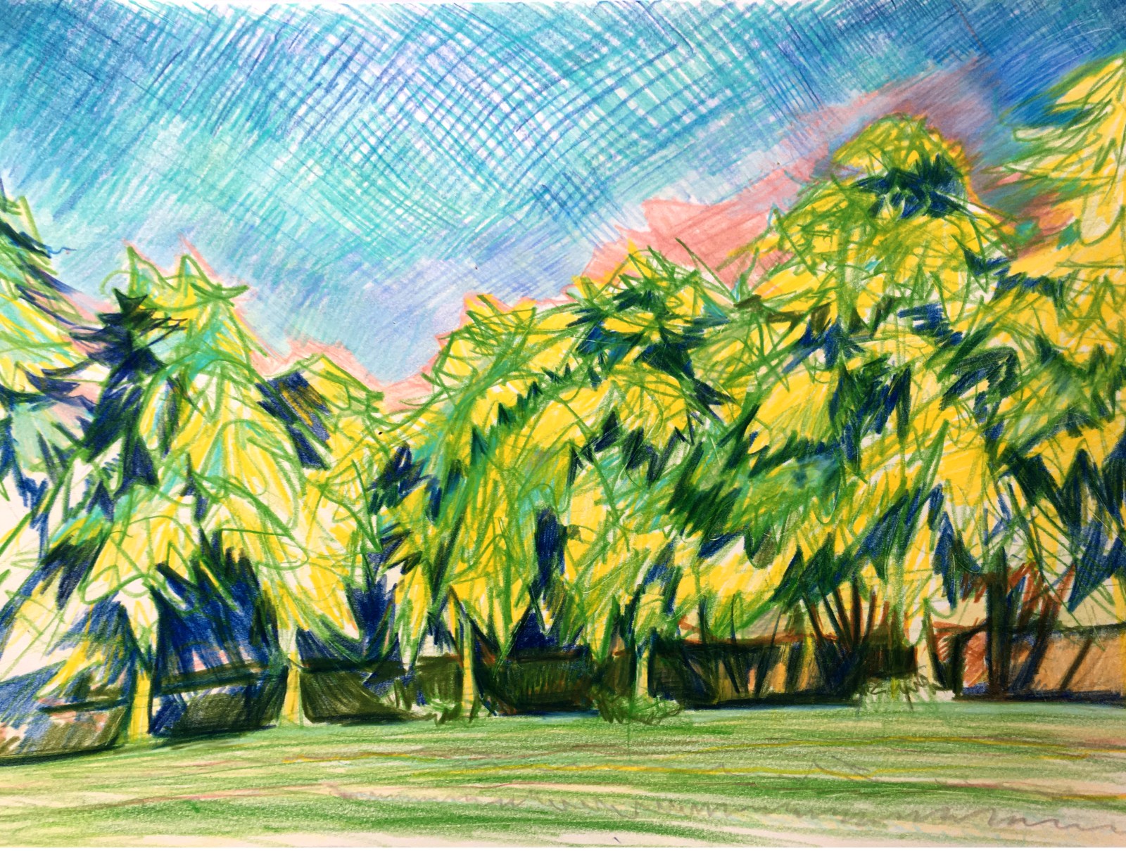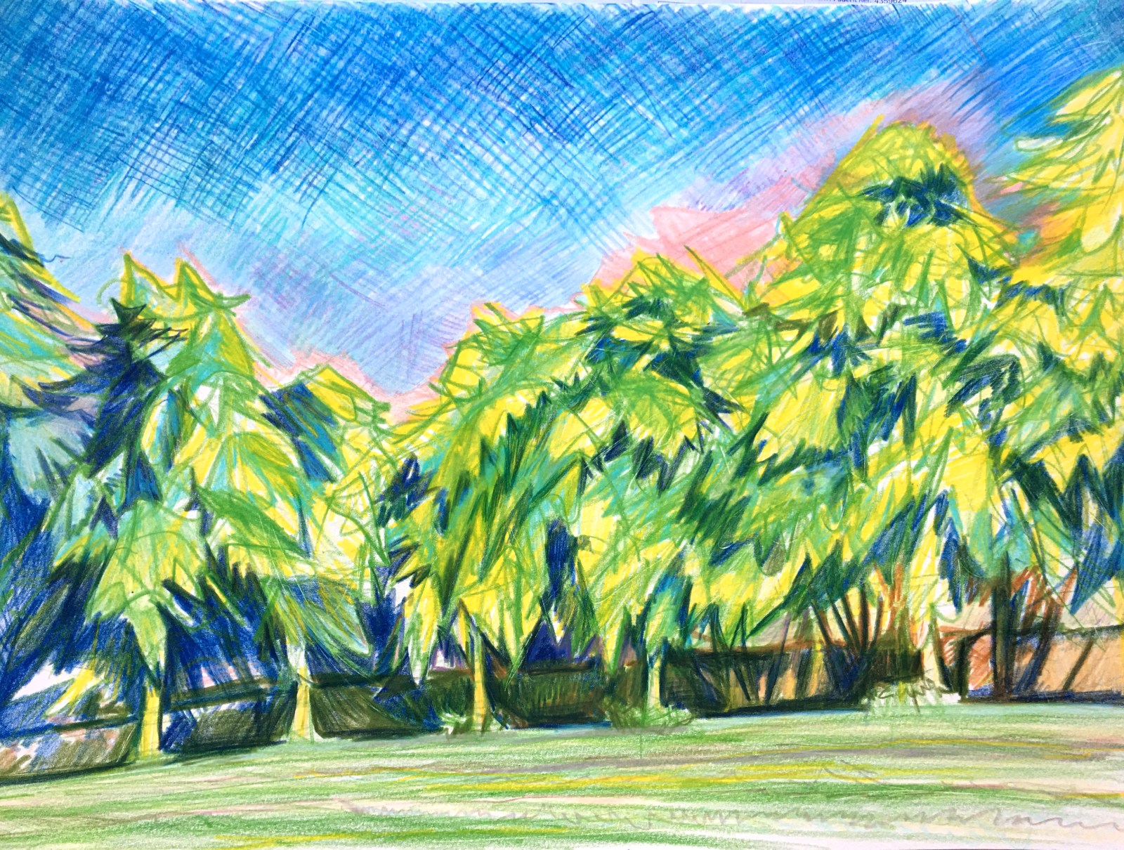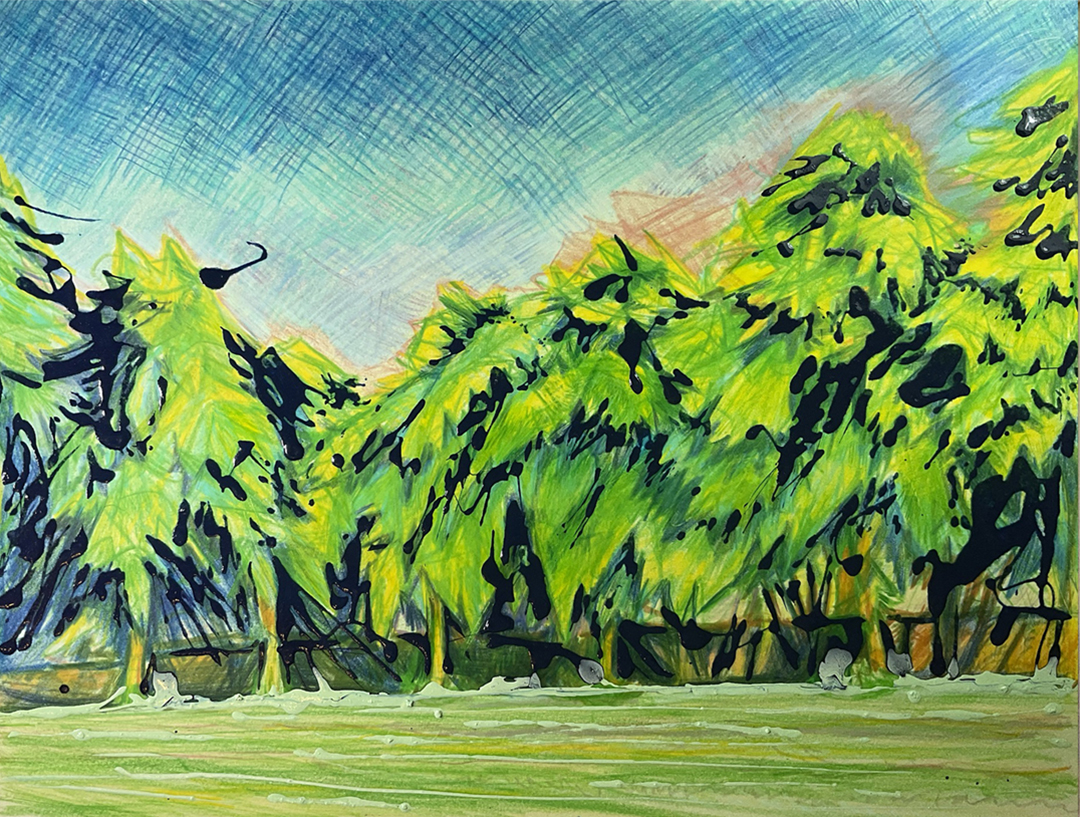 Using a green pencil I outlined the basic shapes of trees and mapped out the overall composition.