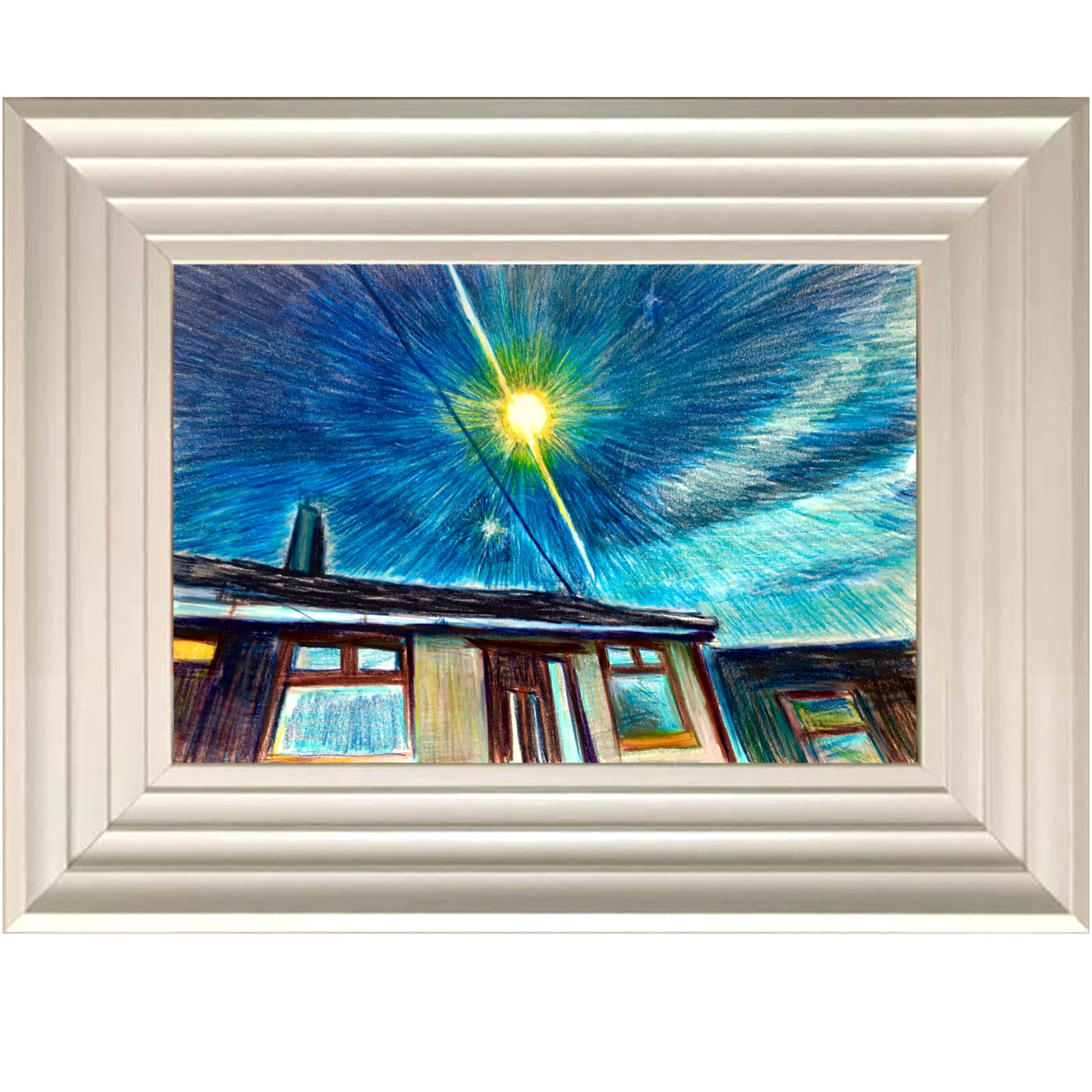 The sky – as the sky is part of the vast space of the Universe, I have used cross-hatching lines, lines that spread with the direction of the lines of perspective, widening