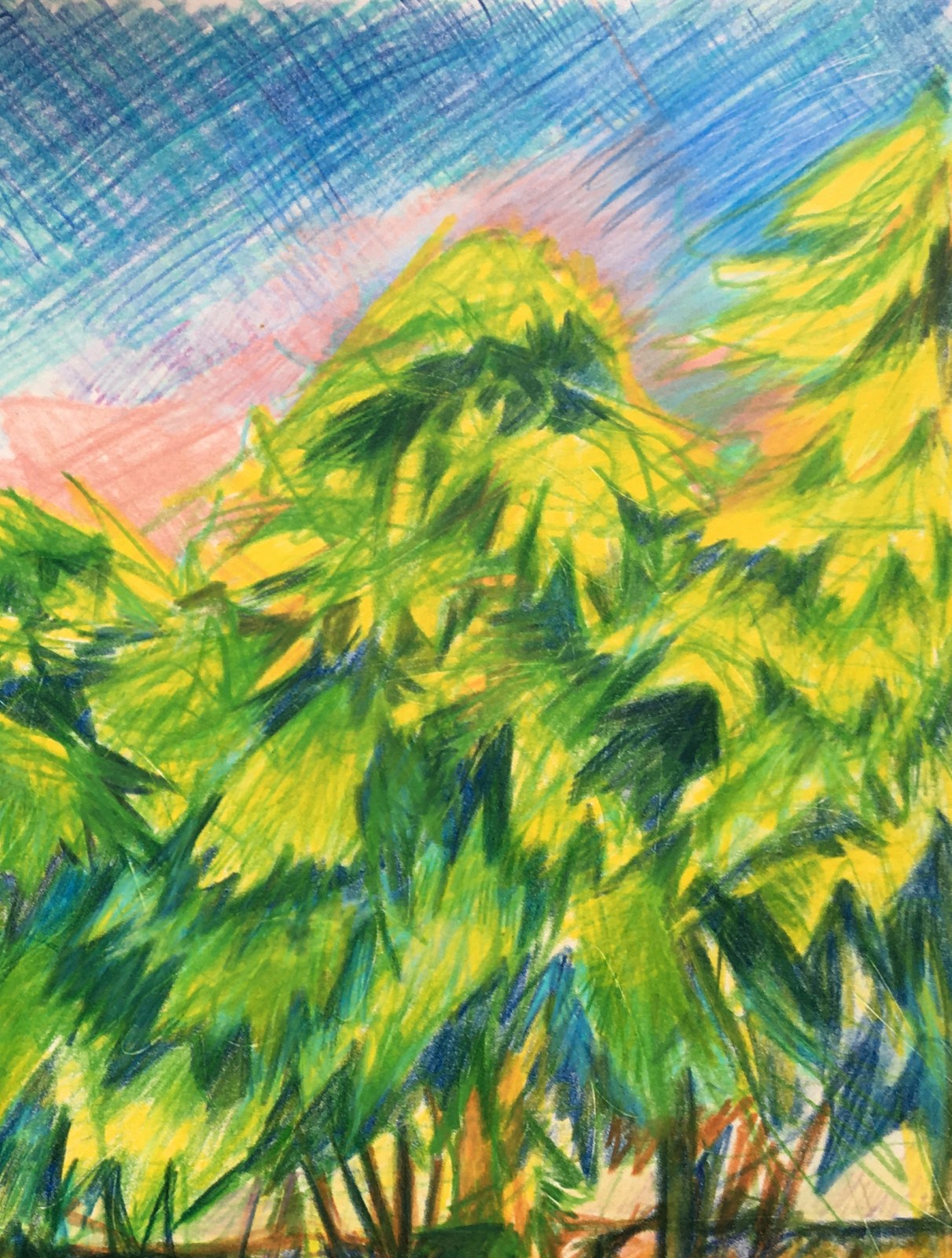 I wanted to create the feeling of heat by starting the sky with light pink colour. This pink placed next to yellow adds so much warmth to this scene. Warms the blue sky – and warms the green trees.